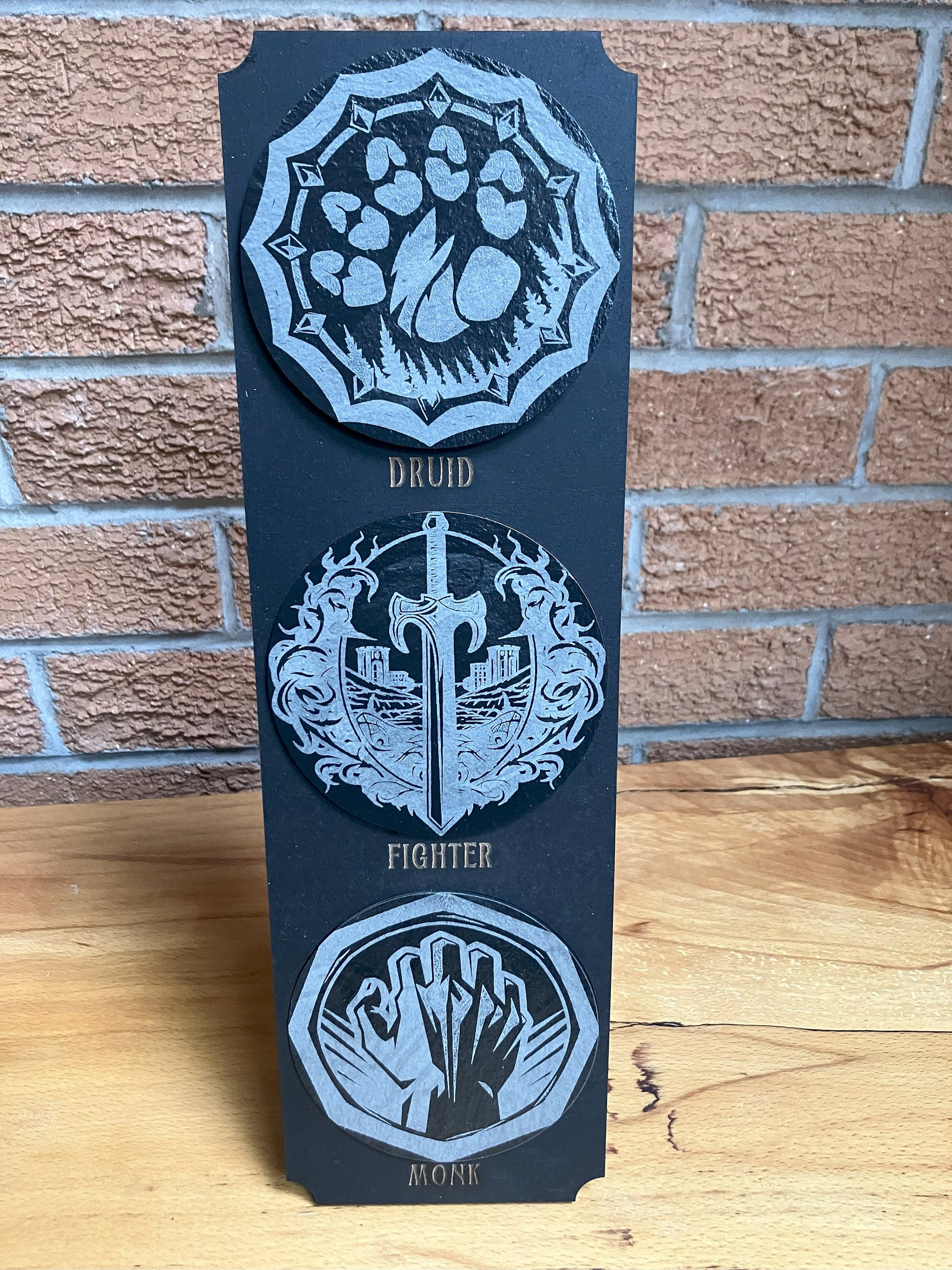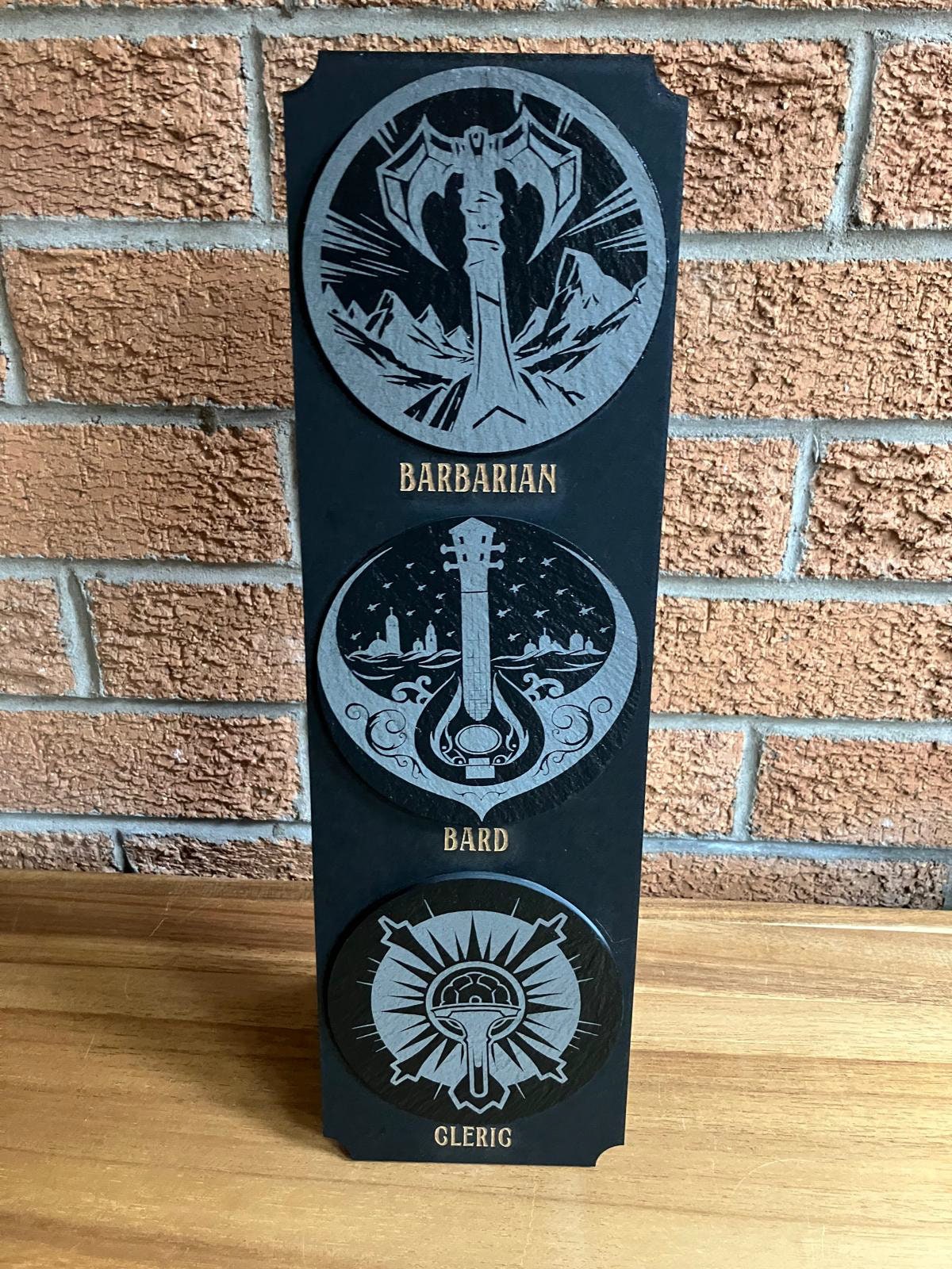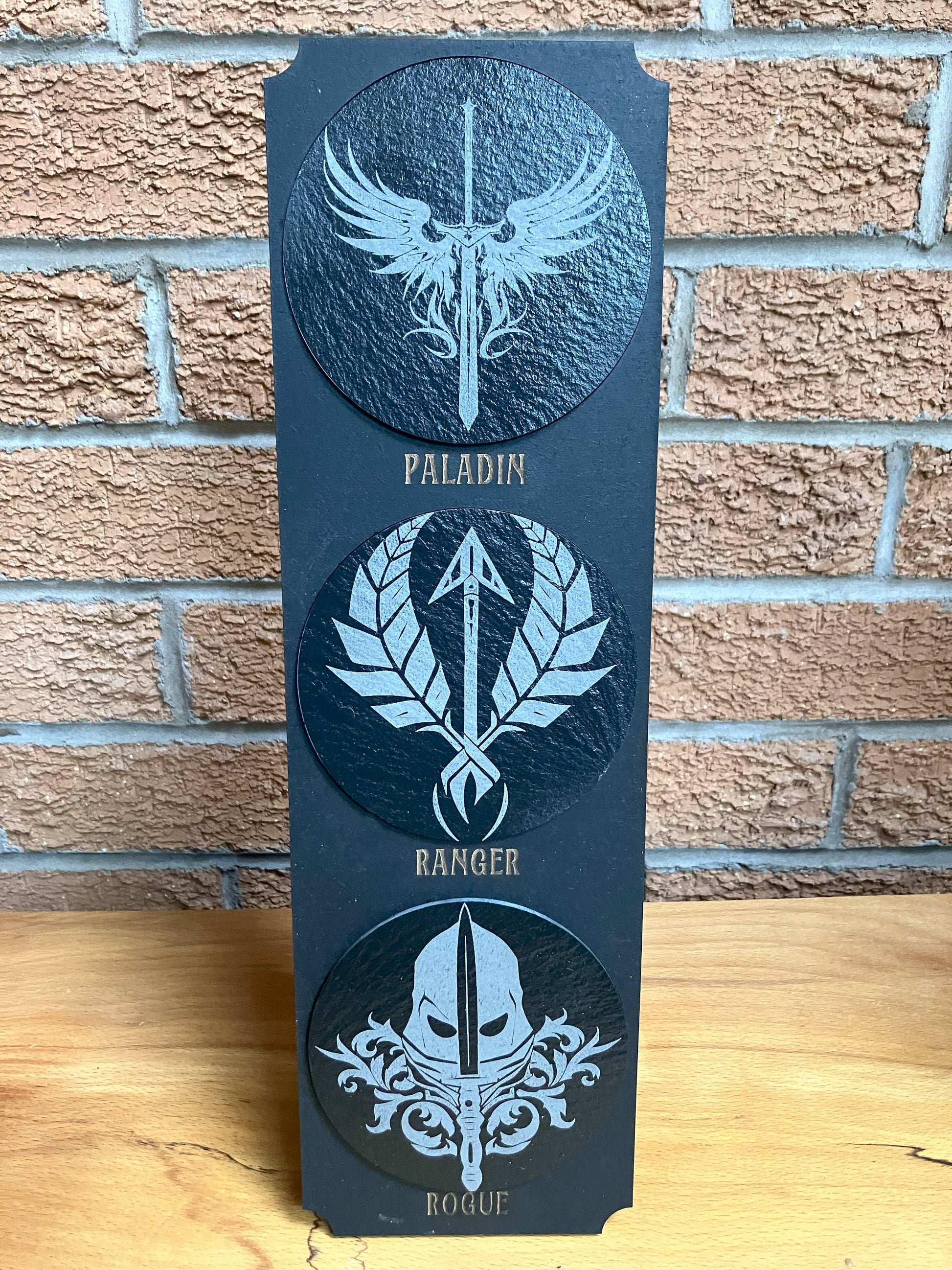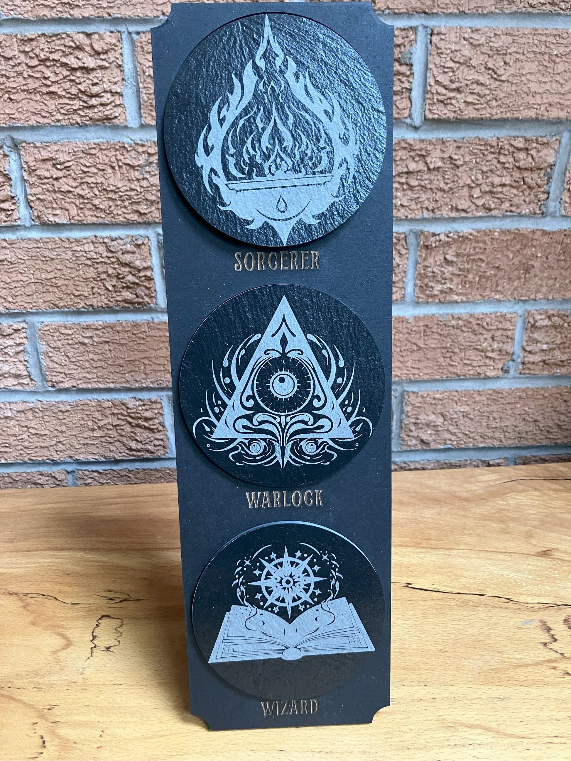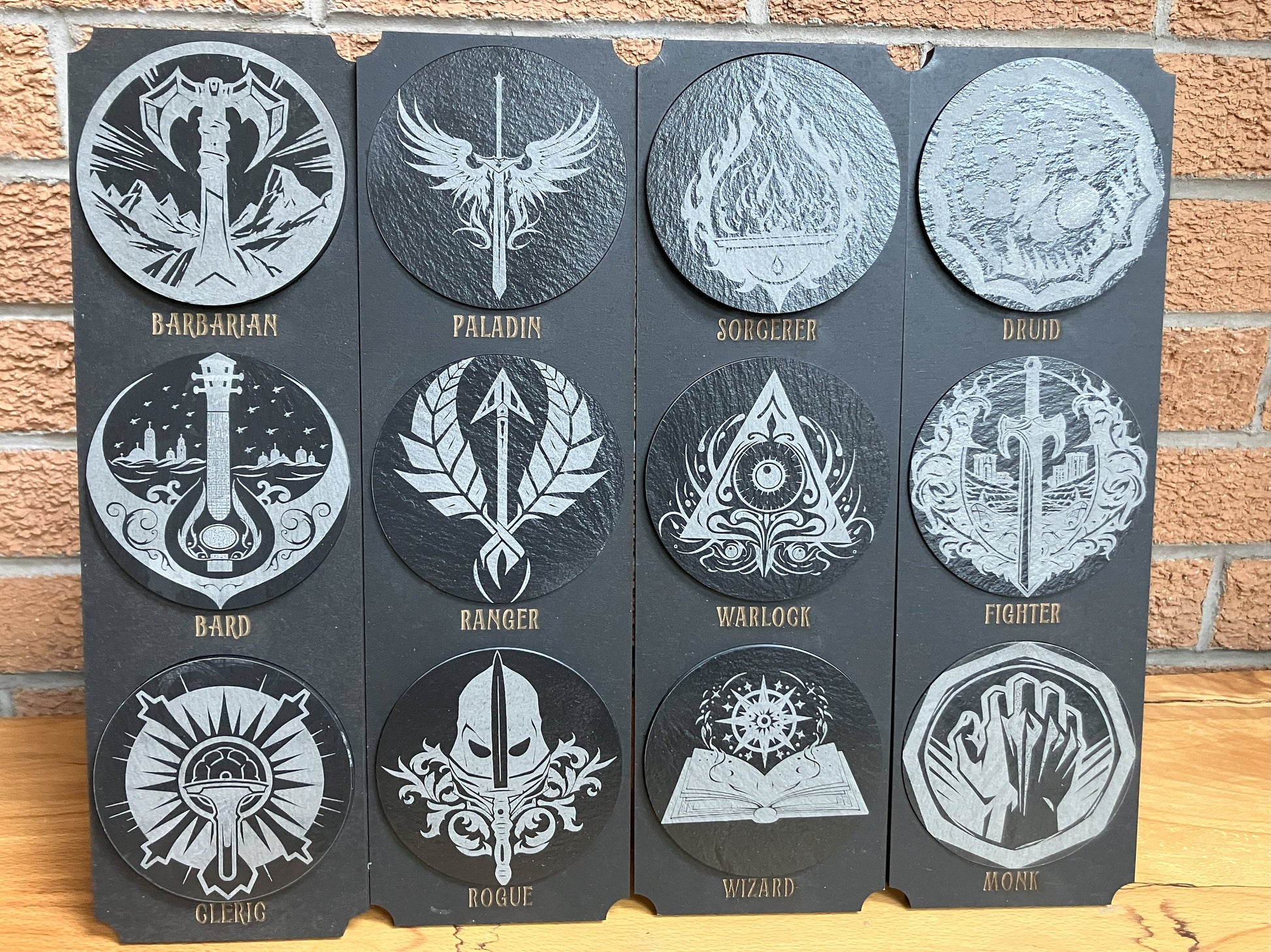 Dungeons and Dragons Slate Coasters A great addition to your gaming night or a lovely gift for your favourite Dungeon and Dragons player. Choose from twelve characters themed slate coasters to be on theme for a gaming session. The coasters have a clear lacquer applied to give the black a little deeper shine and will look great on any table. Each coasters comes with four soft feet, to protect surfaces. If its a few you are after there is also a metal stand available that hold up to 6 coasters.