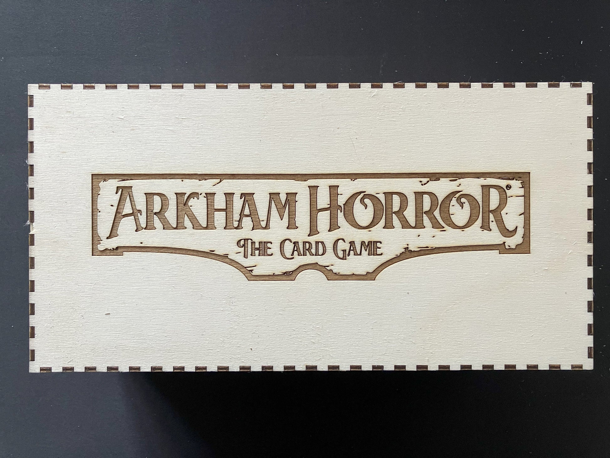 Each double box comes with 10 wooden dividers, more can be purchased. The card dividers shown in the pictures are from Tesseract Games and are quoted as being 101mm H x 64mm with a 1 to 2 mm tolerance. The boxes internal corner supports have been designed so that lid does not damage the dividers, when closed. Each box is themed to match its intended cycle or card group, there is also a generic Arkham Horror option. Designed for ease of use, the sides are lower than the cards allowing for easy access when selecting or returning cards.