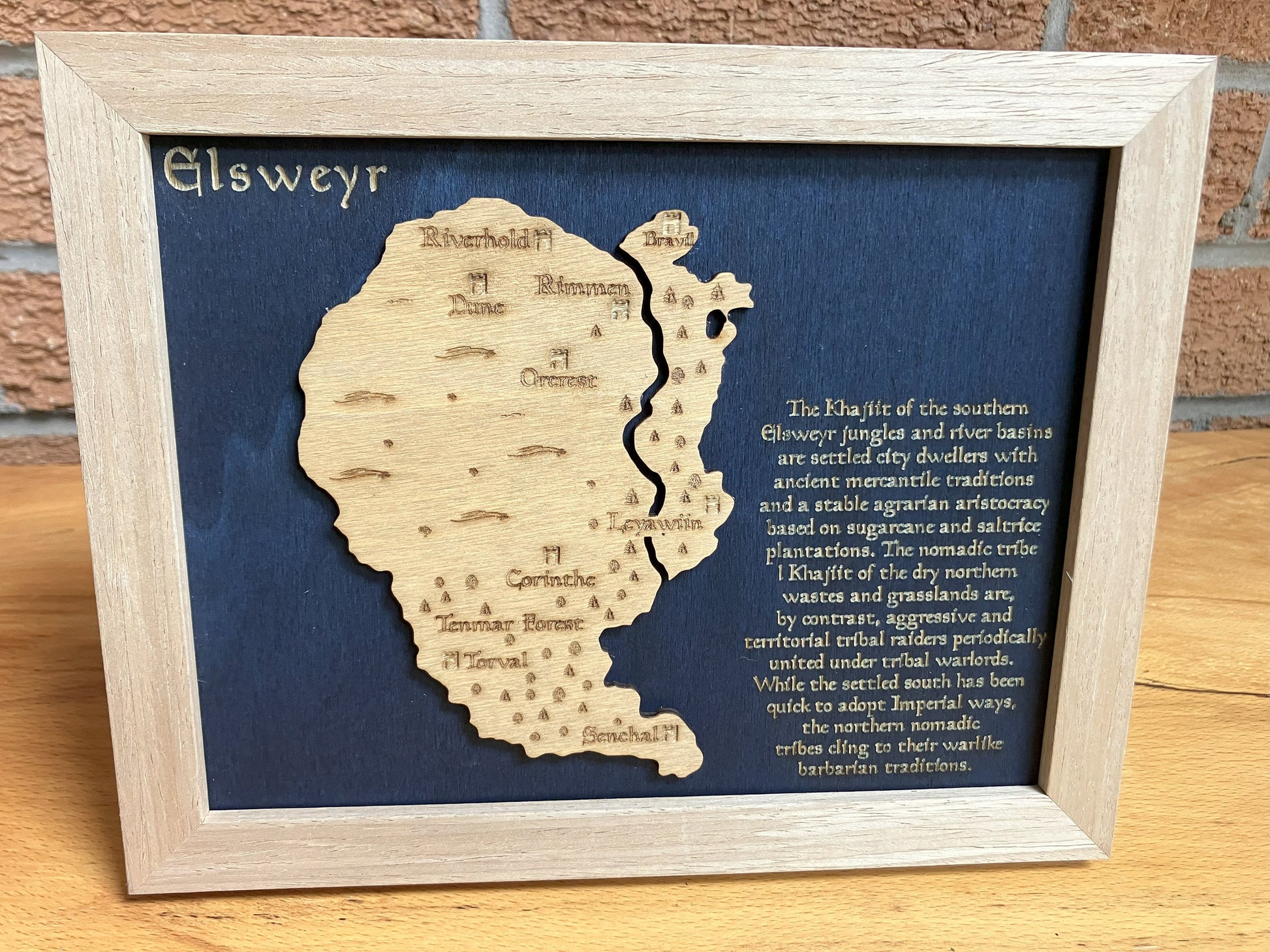 3D relief artwork of Elsweyr map - province of the Tamriel world from Elder Scrolls, made from wood and hand stained, it's a great addition to any wall. Comes in an oak coloured frame with glass (removed for pictures) and ready to hang.