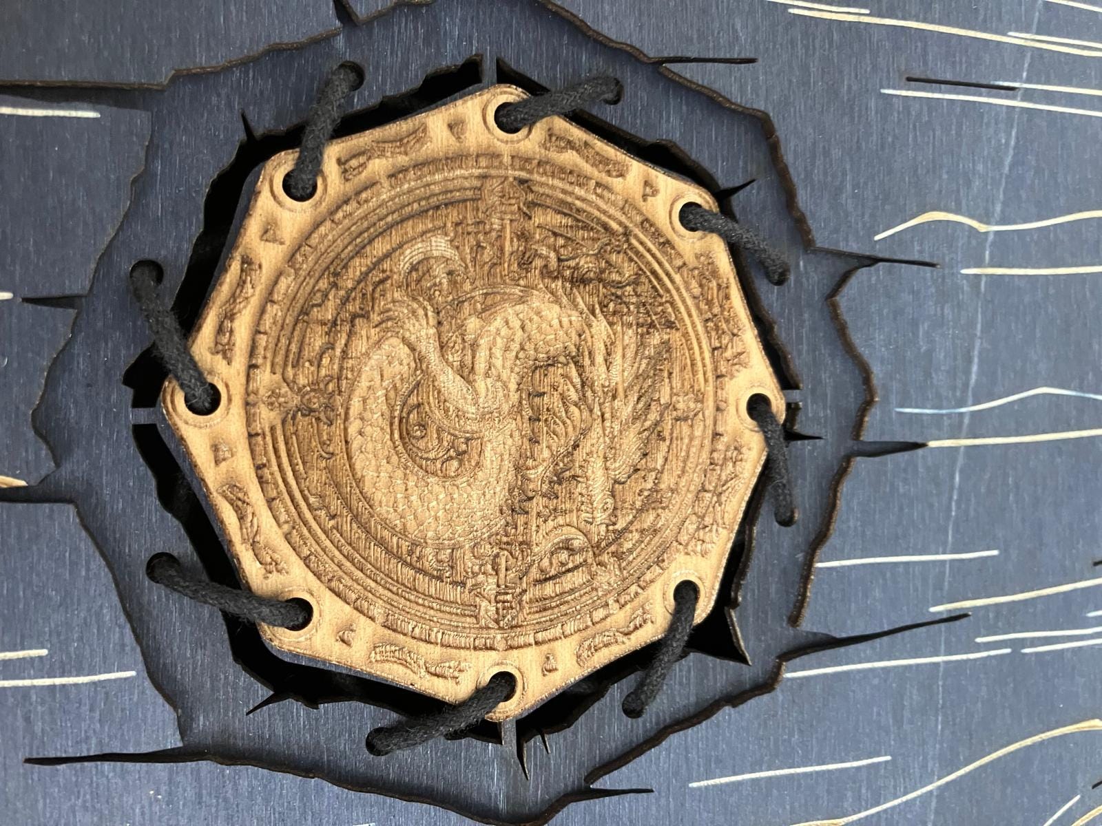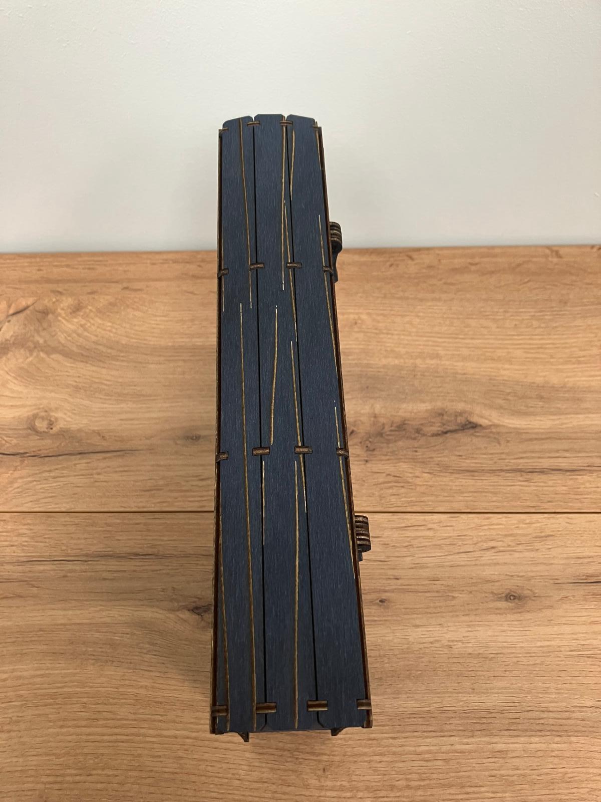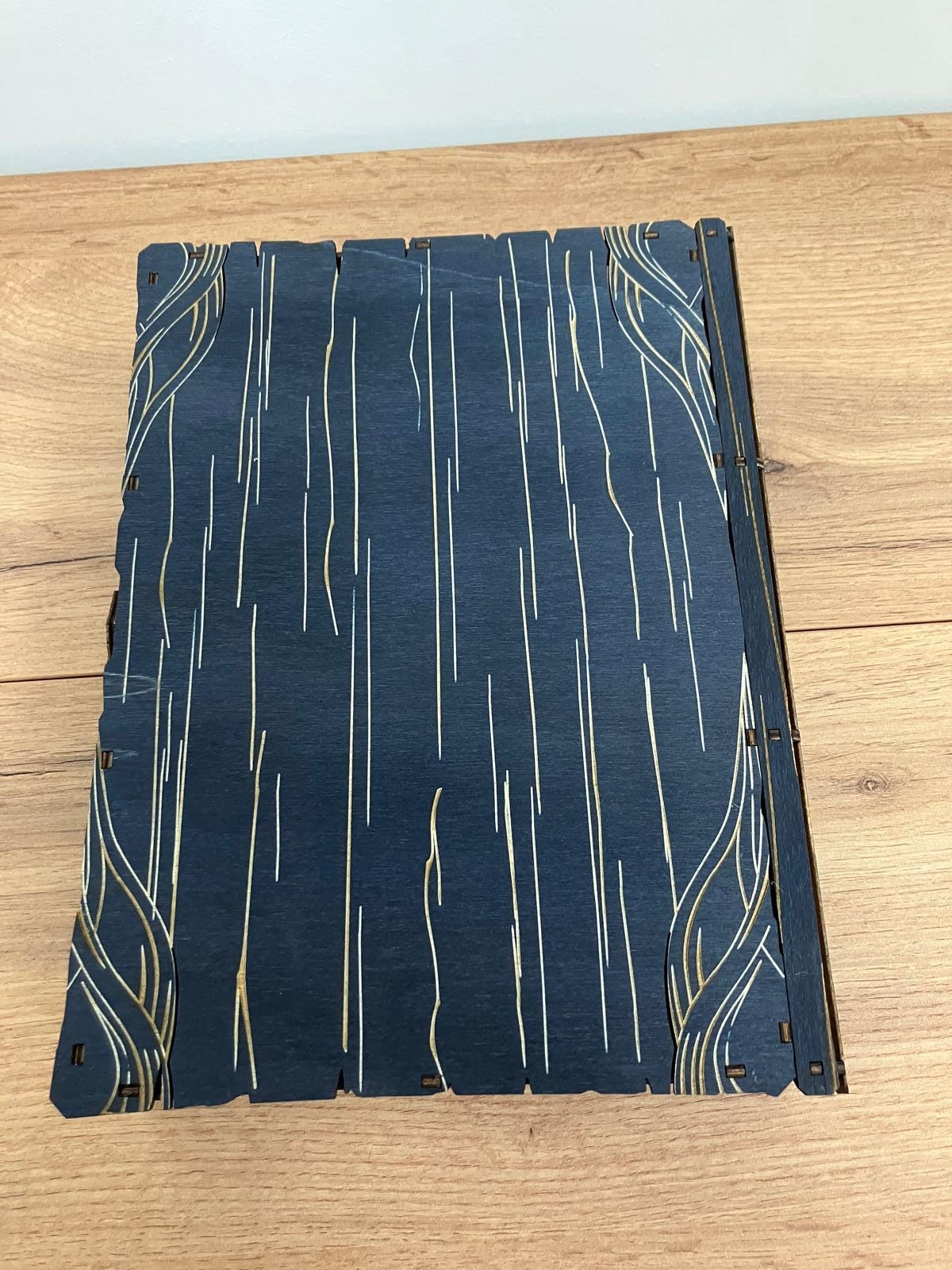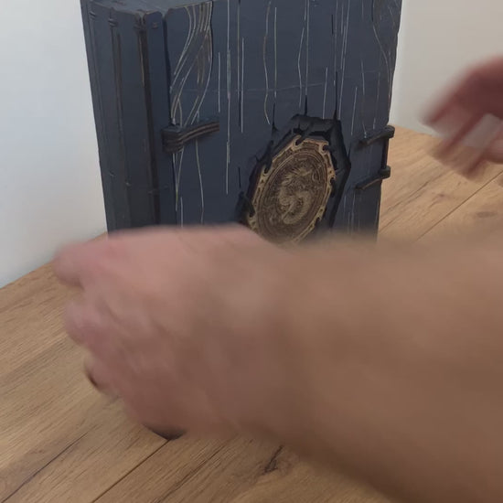 Engraved Wooden Medallion Book Box with integrated hinge and magnetic latch. A fantastic looking box in the style of a book. With engravings on all sides and a beautifully engraved dragon held in place by cord and a plaque to personalise it further, it makes a stunning addition to any collection. With a magnetic clasp it will hold whatever you put in it, safe and secure. Comes in a selection of different colours and is made from 3mm sustainable poplar plywood. If you do want to add a personal touch or change up the engraving or medallion, let me know and I'm sure I can accommodate your request. Box comes fully assembled and ready to hold whatever you wish.