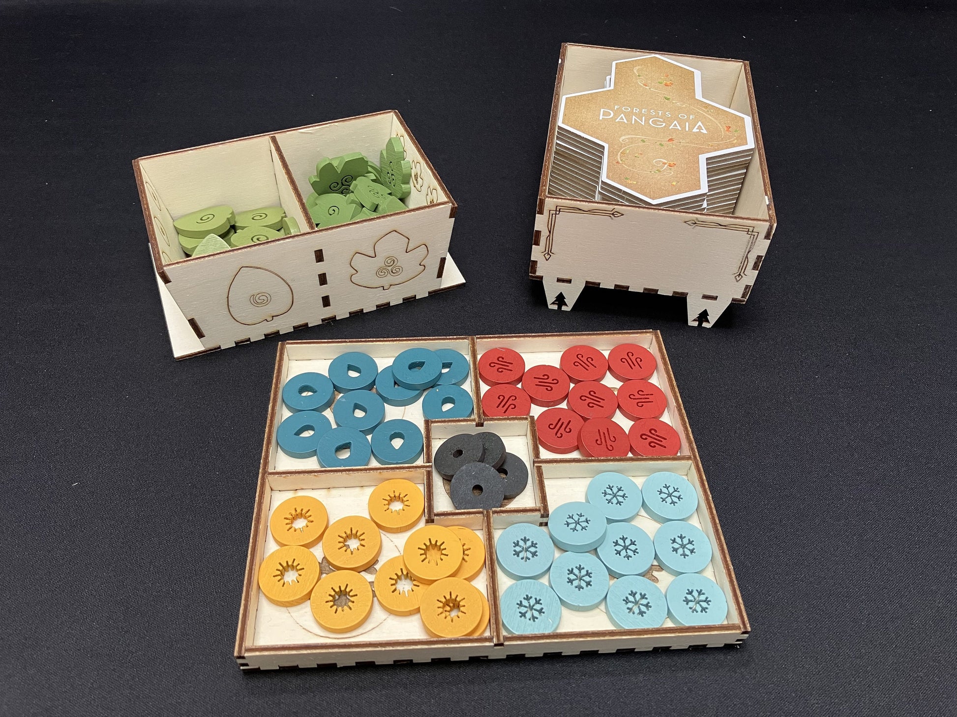Insert for Forests of Pangaia - Kickstarter and retail compatible - Sleeved or Unsleeved - No lid lift. Made from sustainable 3mm Poplar Plywood in either natural or Rosewood stain finish, this set of inserts fits in the base game box with no lid lift. Able to accommodate either the Kickstarter deluxe wooden tokens or the retail cardboard tokens, as well as sleeved or unsleeved cards.