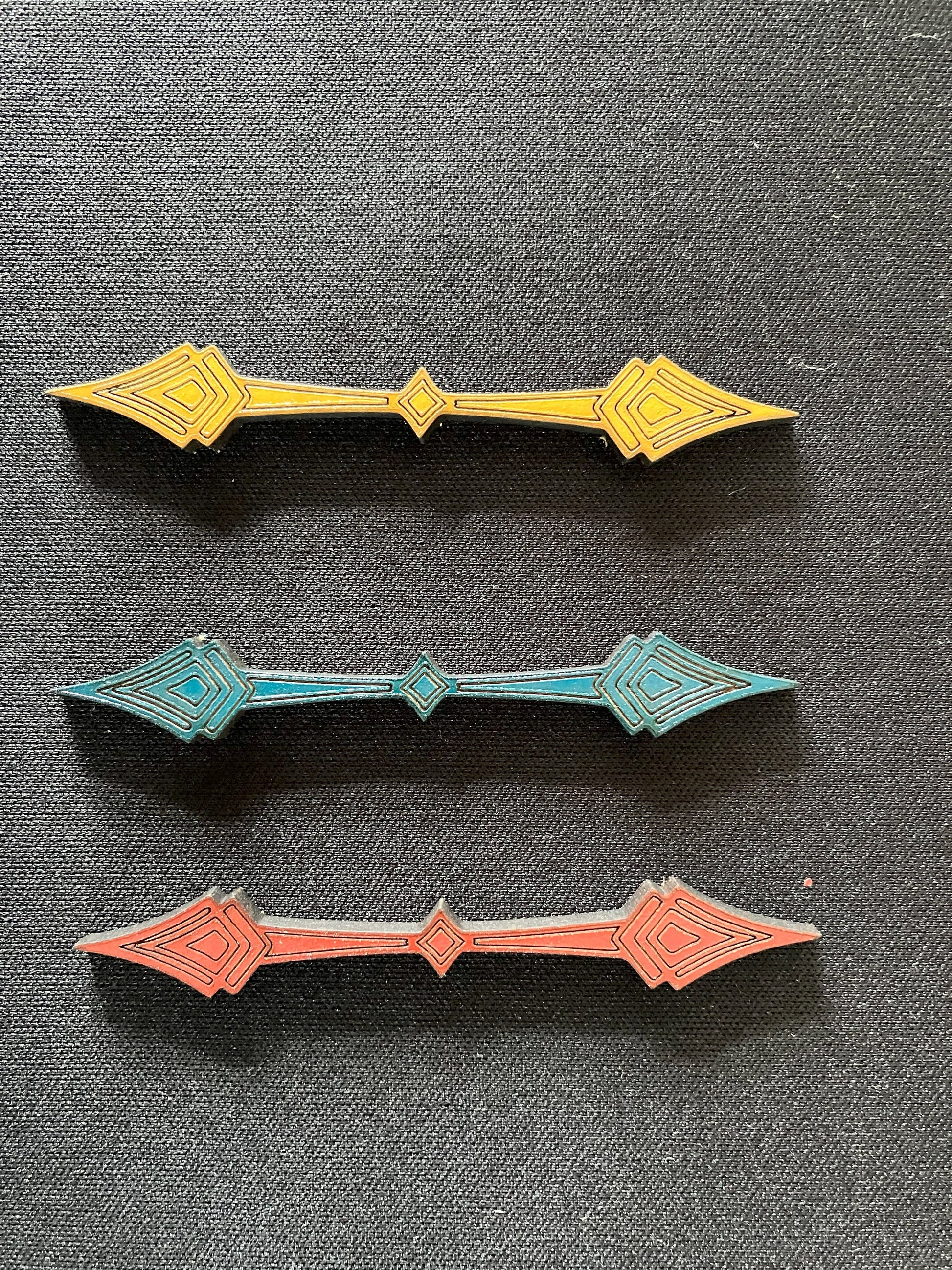 Directional arrows, pointers for Arkham Horror "The Card Game" Keep yourself right with a set of directional pointers/arrows for Arkham Horror "The Card Game". Made from 3mm MDF to give them that little bit more weight, the pointers come in three colours and are engraved with the pointer then finished with a clear lacquer to give it a shine and protect it from the inevitable finger marks. If you play the game you know how useful these can be and with this set of 26 pointers its an inexpensive enhancement to the game play.
