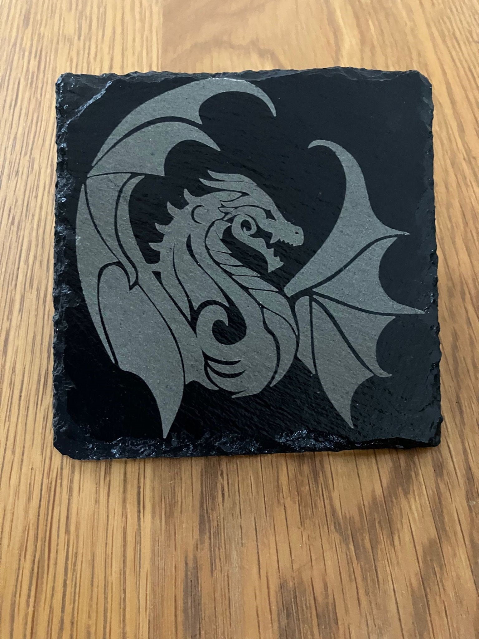 Dungeons and Dragons Slate Coasters. A great addition to your gaming night or a lovely gift for your favourite Dungeon Master. A real on theme set of six coasters with metal holder that will look great anywhere. With different engraving on each coaster and finished in a clear coat that is UV resistant. Each coasters comes with four soft feet, to protect surfaces.