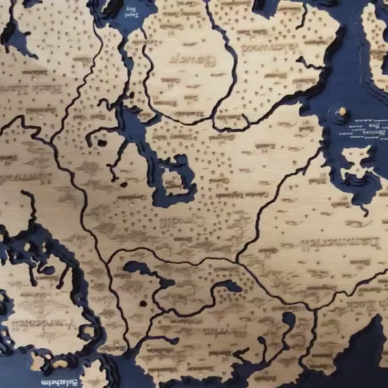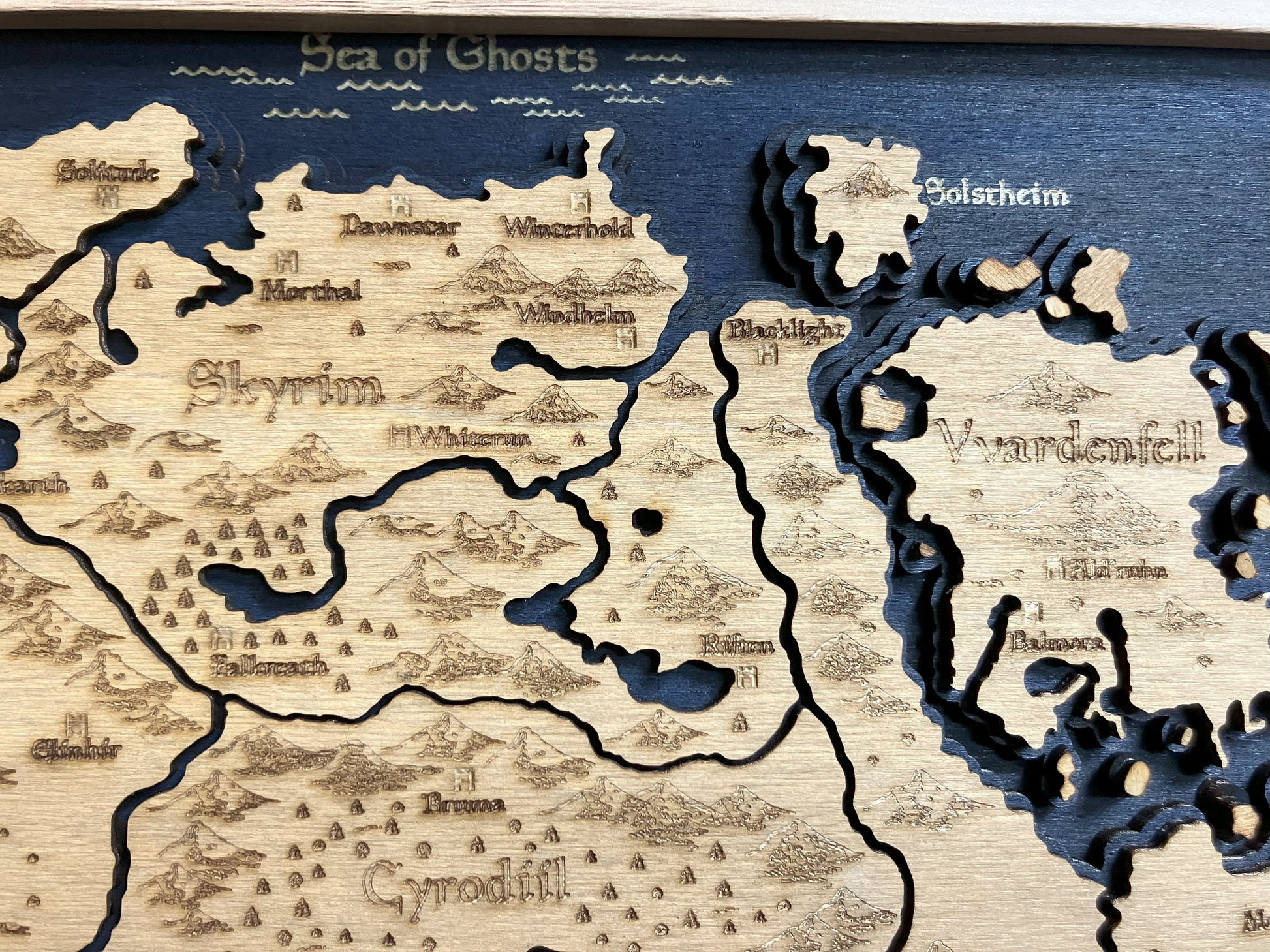 3D relief artwork of Tamriel map, made from wood and hand stained, it's a great addition to any wall. Comes in an oak coloured frame with glass (removed for pictures) and ready to hang.
