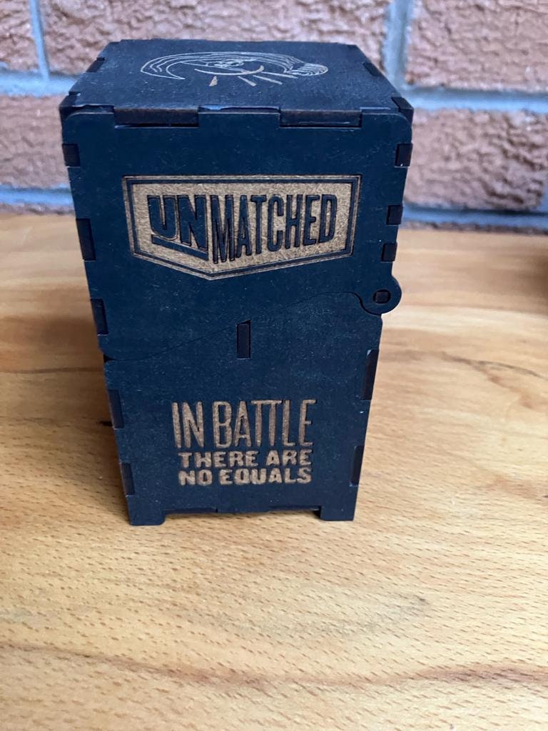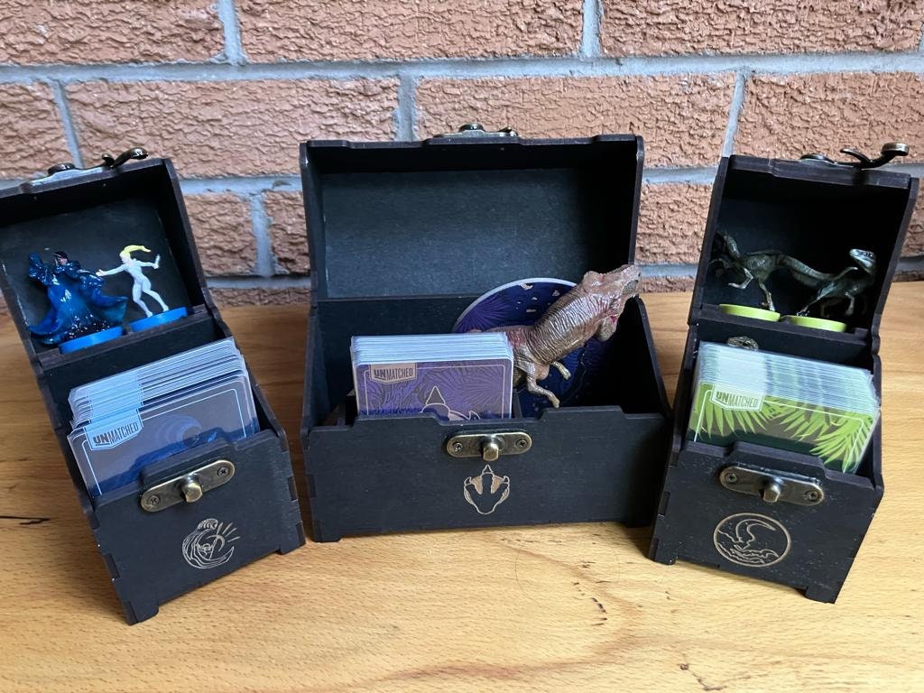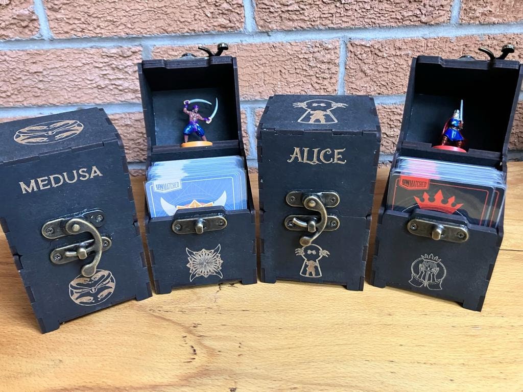 Unmatched Storage Solution - A fantastic modular storage solution with optional Base (Tray and Drawer combo) and single tray. Made from gloss, painted MDF this individualised storage solution for unmatched figures, tokens, dials and cards allows you to select just the characters you want to play, without going through multiple boxes. Each box is engraved with the name and icon of the character with the miniature neatly stored in the lid for easy access and to keep those painted figures in great condition. All secured with an antique brass style clasp to keep everything safe and secure. There is also a double box for T-rex that stores this larger miniature along with the cards and dial . Each set of boxes is sold per game so come in sets of one, two, three or four, just pick your game and the set is yours.
